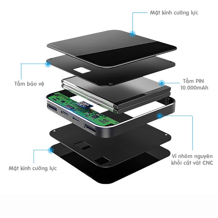 Sạc dự phòng mặt kính 20000mAh có đèn pin và hiển thị % pin