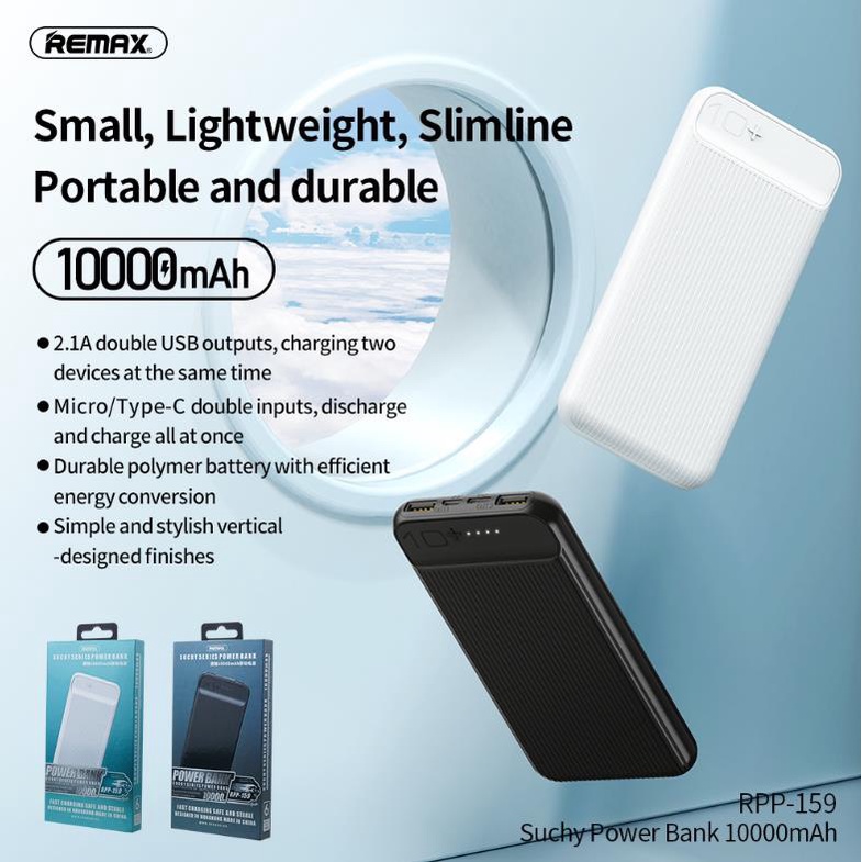 Sạc dự phòng Remax 10.000mAh RPP159 trang bị lõi pin Lithium-Polymer cao cấp và chip sạc thông minh, đảm bảo tiêu chuẩn quốc tế và an toàn bay. RPP-159 chắc chắn sẽ là một phụ kiện không thể thiếu trong mọi chuyến du lịch của bạn.