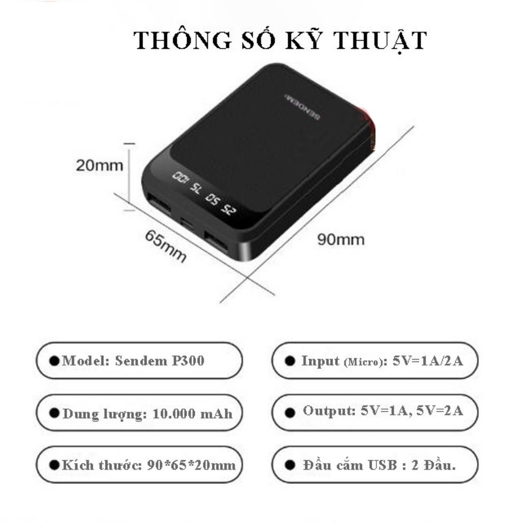 Sạc Dự Phòng Mini Cầm Tay Thông minh Sendem P300 Chính Hãng dung lượng 10000mah, thiết kế nhỏ gọn tiện dụng nhiều màuSạc dự phòng Sendem #P300 -10000 Ah