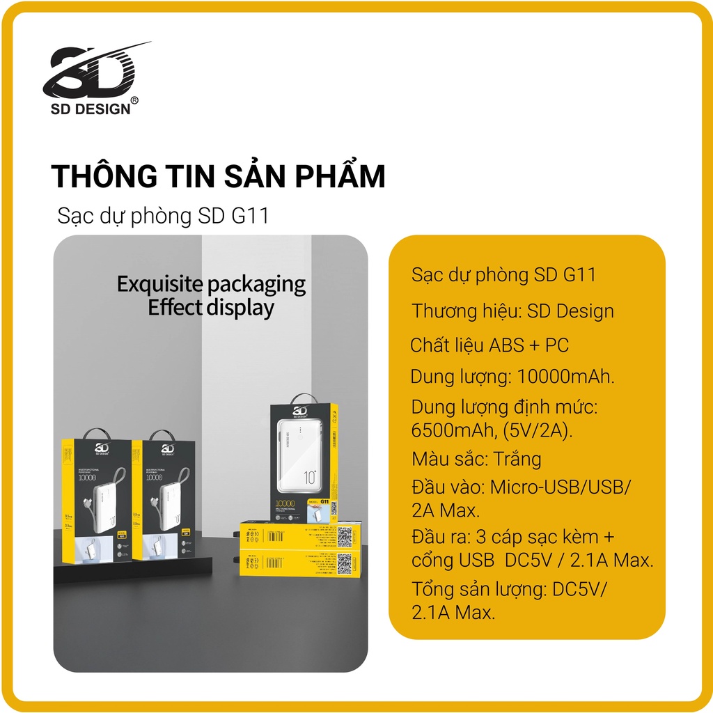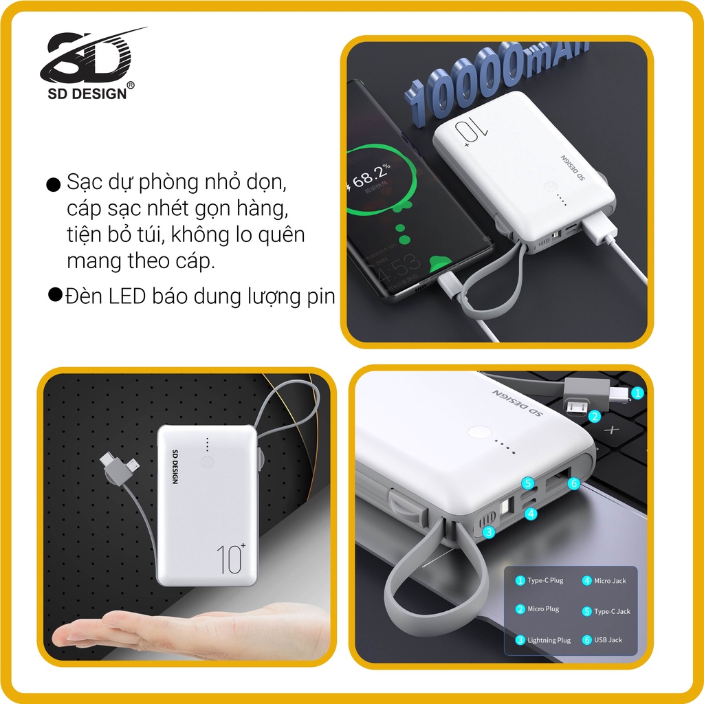 Sạc dự phòng Mini chính hãng SD DESIGN G11 dung lượng 10.000 mAh có đầy đủ chân sạc cho iphone, samsung, xiaomi,...