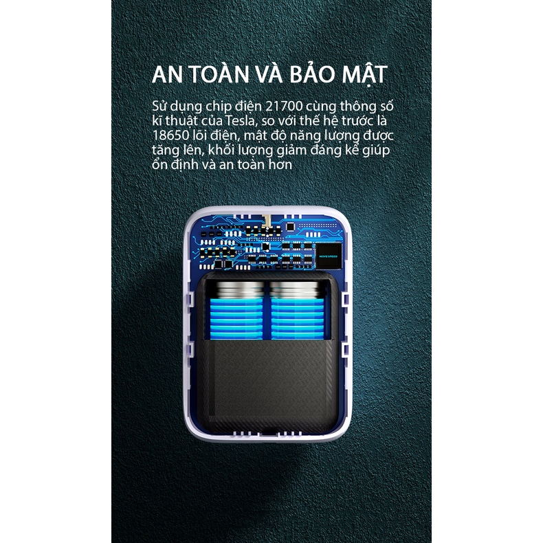 + Sử dụng chip điện tử 21700 cùng thông số kĩ thuật của Tesla, so với con chip lõi điện thế hệ trước là 18650 thì mật độ năng lượng được tăng lên, khối lượng giảm đi đáng kể giúp sạc sử dụng ổn định và an toàn hơn.