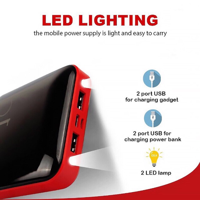 - 2 cổng output USB 2A, có thể sạc cùng lúc 2 thiết bị: ipad, mp3,mp4, camera, phone,....
