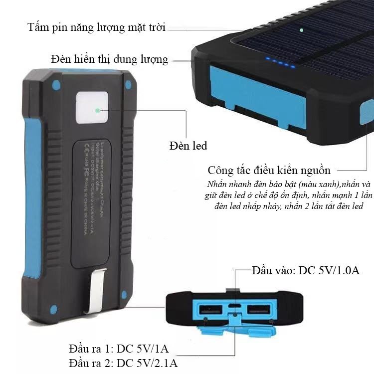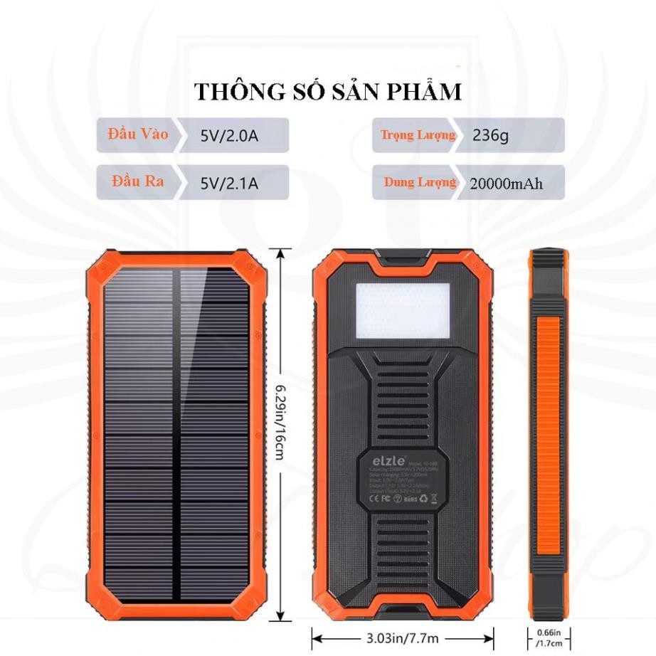 1. Công suất thiết kế 20000mAh, (chia 2 cổng), có thể nạp năng lượng dưới ánh sáng mặt trời.