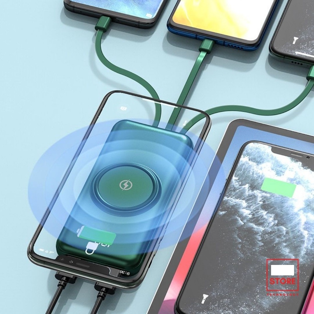 Sạc dự phòng, Pin dự phòng 10000mAh có sạc không dây kèm 4 dây sạc T014 - Bảo hành lỗi 1 đổi 1