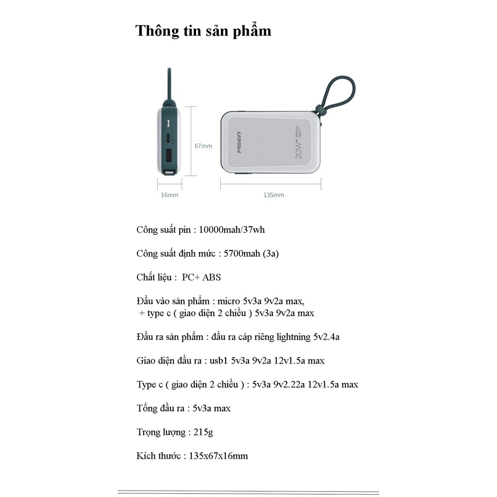💖 Nhà sản xuất: PISEN GROUP, nhà phát minh ra sạc dự phòng đầu tiên trên thế giới với kinh nghiệm gần 20 năm nghiên cứu và phát triển các dòng sản phẩm sạc dự phòng, nguồn điện di động. Sản phẩm được nghiên cứu, phát triển, sản xuất và kiểm tra chất lượng nghiêm ngặt trước khi xuất xưởng, đảm bảo các tiêu chuẩn chất lượng nghiêm ngặt tại các thị trường khó tính như Mỹ, Nhật, EU, Dubai, Nga,…🍄 Sản phẩm đáp ứng đầy đủ các tiêu chuẩn quốc tế: PSE, RoHs, FCC, CE, BQB, UL, CB