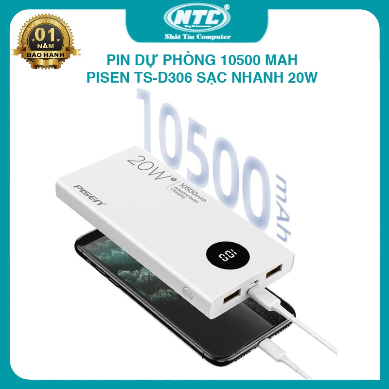 Sạc dự phòng Pisen TS-D306 dung lượng 10500mAh có LCD - hỗ trợ QC 3.0 và PD 20W (Trắng) - Nhất Tín Computer