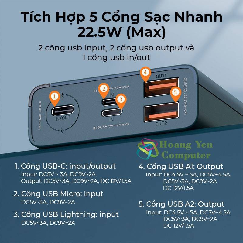 ✅ Trang bị 2 cổng sạc ra USB và 1 cổng sạc ra TYPE C 18W. Sạc cùng lúc 2,3 cổng sẽ là sạc thường
