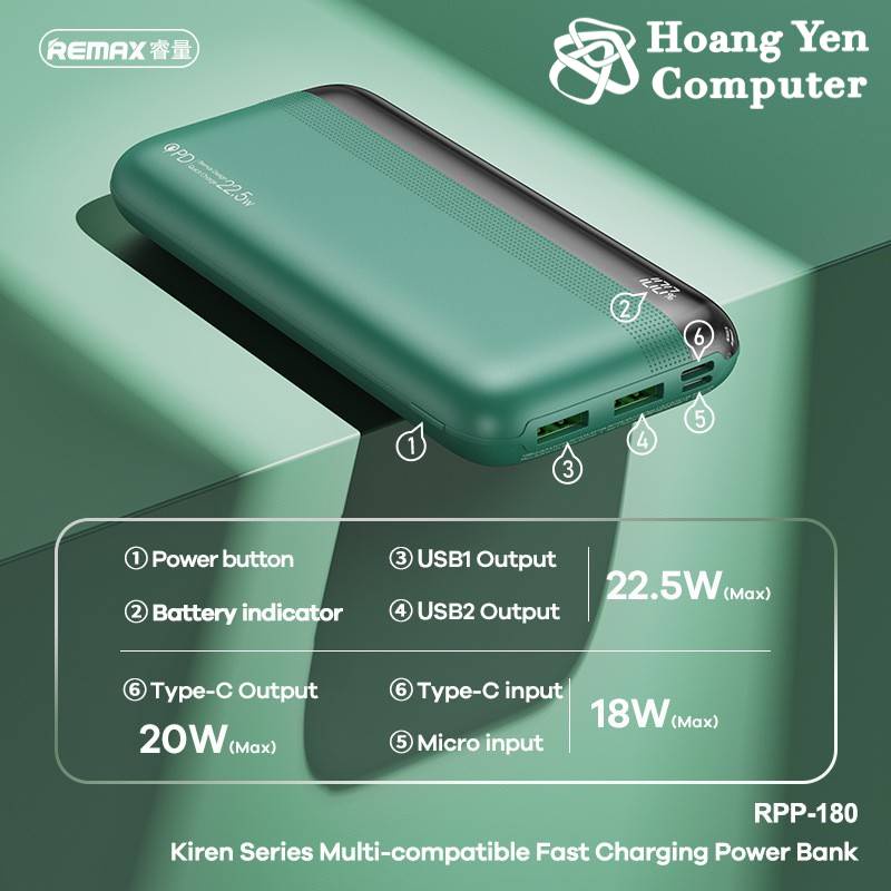 Sạc Dự Phòng Remax RPP-180 20000Mah (Sạc Nhanh QC3.0 18W, 22.5W, PD 20W, VOOC 2.0) - BH 1 Năm - Hoàng Yến Computer
