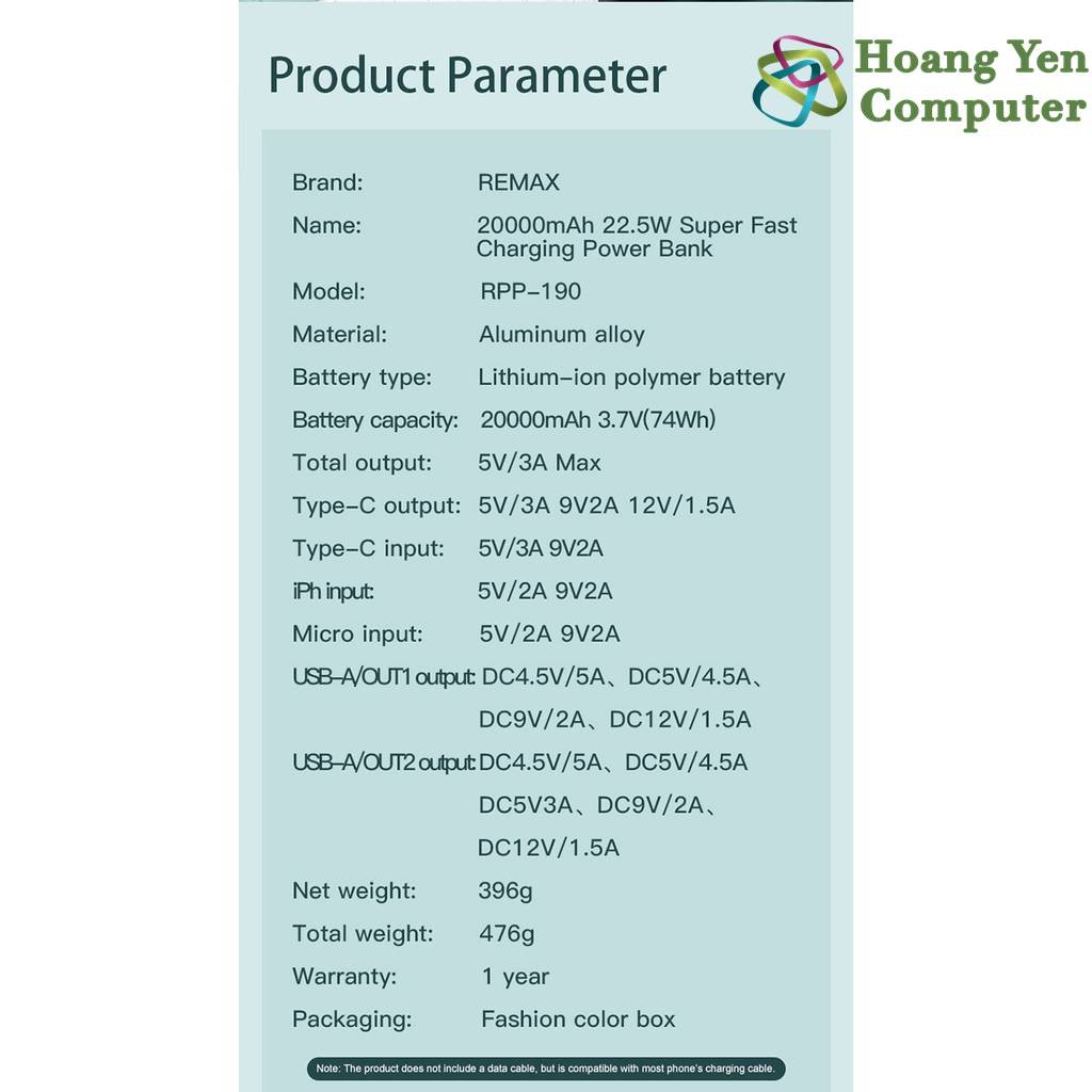 Giới thiệu Sạc Dự Phòng Remax RPP-190 20000Mah (Sạc Nhanh QC3.0 18W, 22.5W, PD 18W, VOOC 2.0) - BH 1 Năm - Hoàng Yến Computer