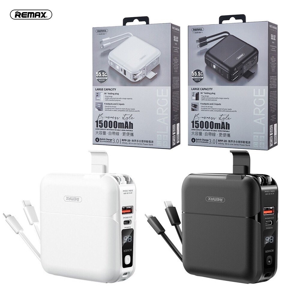 Sạc Dự Phòng Remax RPP-20 - Hỗ Trợ Sạc Nhanh QC3.0 + PD18W - Tích Hợp 2 Cáp Sạc TypeC & Lightning - Dung Lượng 15000mA
