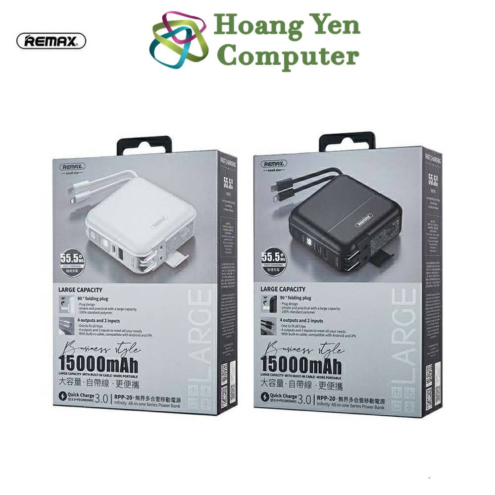 Sạc Dự Phòng Remax RPP-20 15000Mah (Sạc Nhanh QC3.0, PD 18W), Tích Hợp Cáp Sạc, Nguồn AC Sạc Trực TiếpBảo hành 1 năm bằng tem tại shop. 1 đổi 1 trong 2 tuần đầu nếu lỗi kĩ thuật và sản phẩm còn mới không trầy xước (Quý khách vui lòng giữ lại hộp và phụ kiện). Hổ trợ phí ship 2 chiều trong 15 ngày đầu nếu sản phảm bị lỗi. Sản phẩm cần mở hộp để dán tem bảo hành.