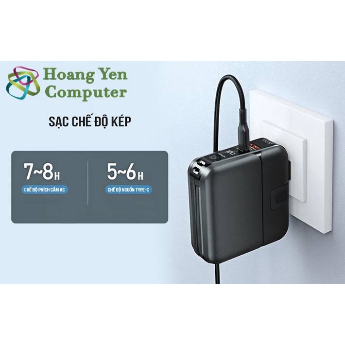 Dù thiết kế nhỏ gọn, nhưng pin sạc dự phòng đa năng này lại tích hợp ngay trên pin 2 cáp sạc Type C và Lightning để sạc cho điện thoại. Chân cắm AC giúp cắm pin trực tiếp vào ổ điện để sạc lại.