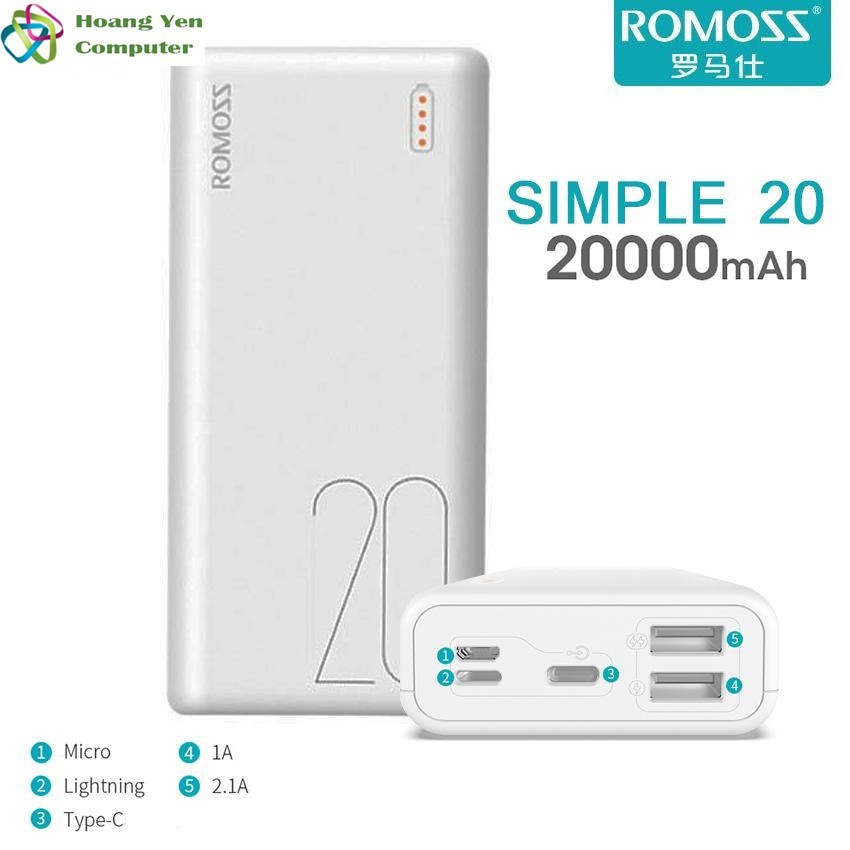 Sạc Dự Phòng Romoss Simple 20 Mini 20000Mah 3 Cổng Sạc Vào - Bh 1 Năm | Pin Dự Phòng Romoss Simple 20