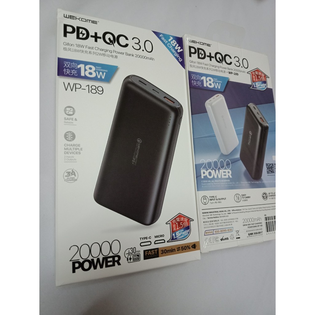 Pin sạc dự phòng 20000mAh WP-189 có dung lượng lớn, với 2 cổng sạc tiện lợi giúp bạn nạp đầy năng lượng cho các thiết bị điện thoại một cách nhanh chóng và tiện lợi.