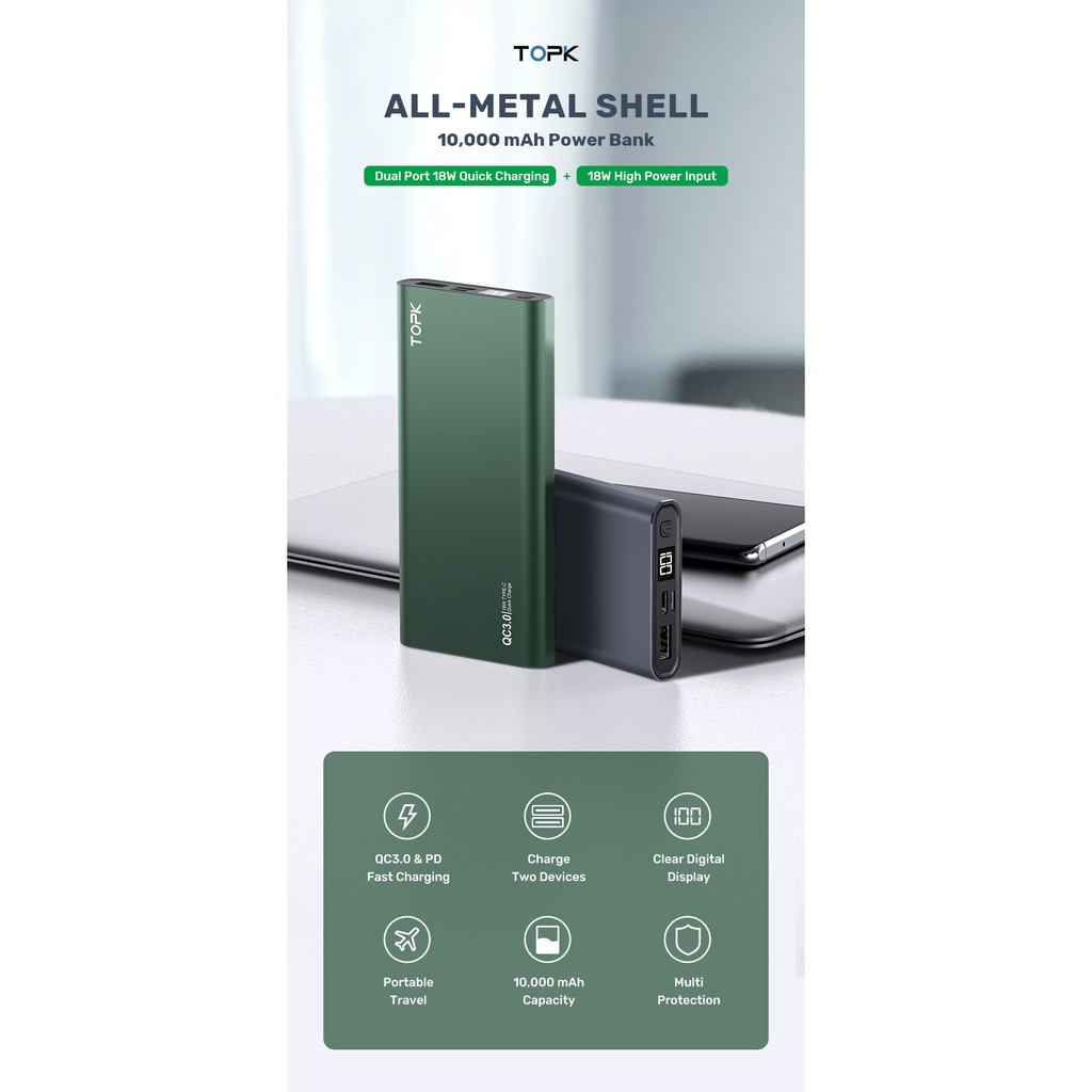 Ưu Điểm :Pin sạc dự phòng TopK Type-C 10000mAh .Đều sạc ra và vào được qua cổng type-C , đều hỗ trợ sạc nhanh 18W. Topk Áp dụng kiểu thiết kế mới, hiện đại và cao cấp hơn, đi kèm với tính năng sạc nhanh 2 chiều lên đến 18W, mà mức giá lại cực kỳ tốt. Một trong những viên pin dự phòng 10000mAh tuyệt vời đáng để bạn sở hữu.