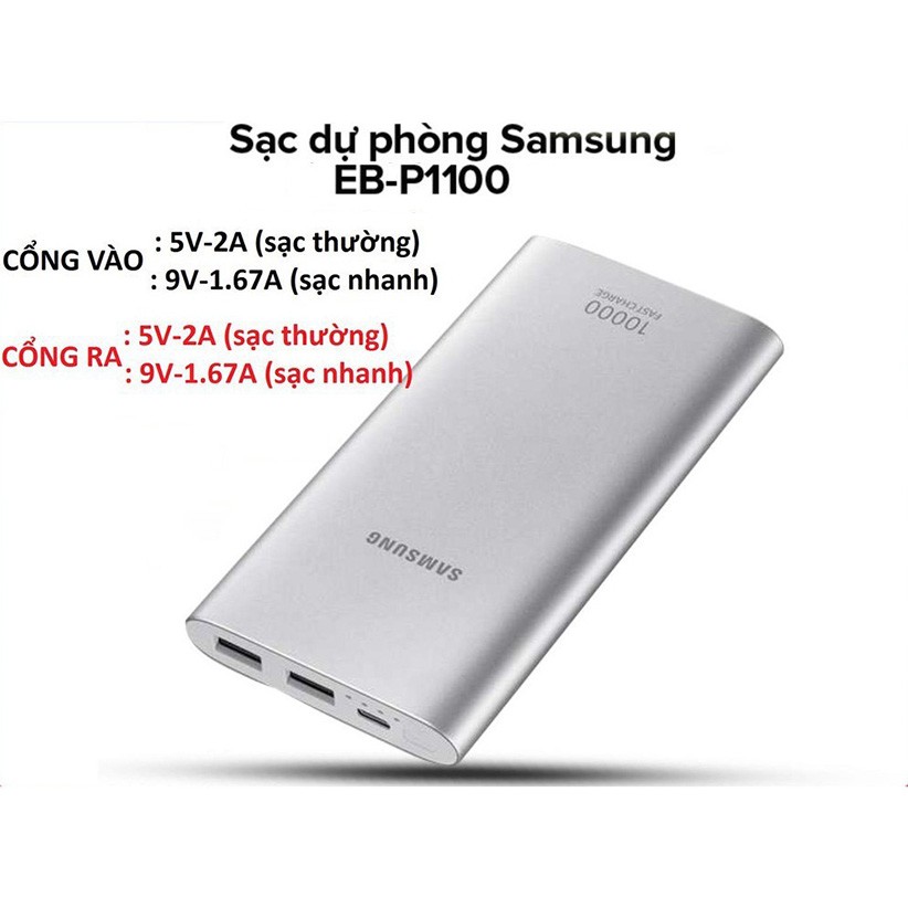 - Pin sạc dự phòng nhanh Samsung 10000mAh EB-P1100 có thể tự nhận biết nguồn điện thiết bị, sẽ tự động điều chỉnh nguồn áp phù hợp để sạc cho thiết bị, tương thích sử dụng cho điện thoại thông minh, máy tính bảng các thương hiệu: Apple, Samsung, HTC, BlackBerry và các thiết bị máy ảnh, máy chơi game...