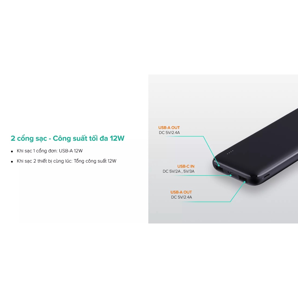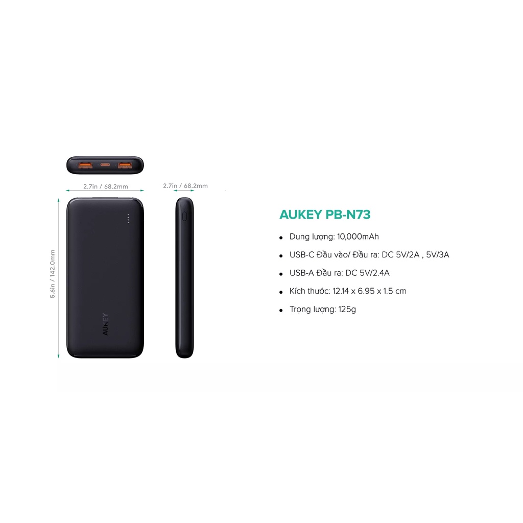 SẠC DỰ PHÒNG 10.000 MAH AUKEY PB-N73Pin Sạc Mỏng Nhất, 1 Cổng Sạc Tốc độ cao USB-C 15W + 2 Cổng USB-A