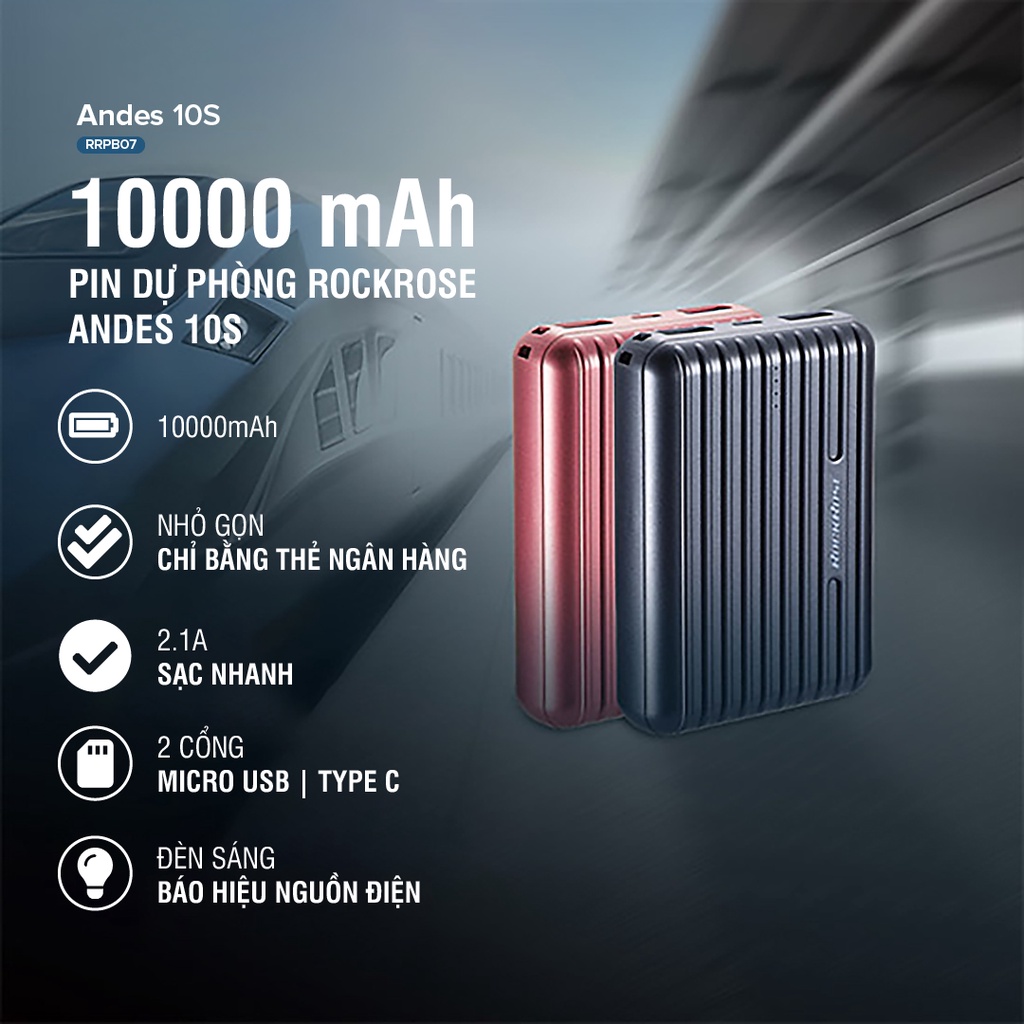 SẠC DỰ PHÒNG SIÊU NHỎ 10000mAh ROCKROSE ANDES 10S QC 3.0 - CỔNG USB A SẠC NHANH CHO IPHONE/ ANDROID- Màu sắc: Grey, Red