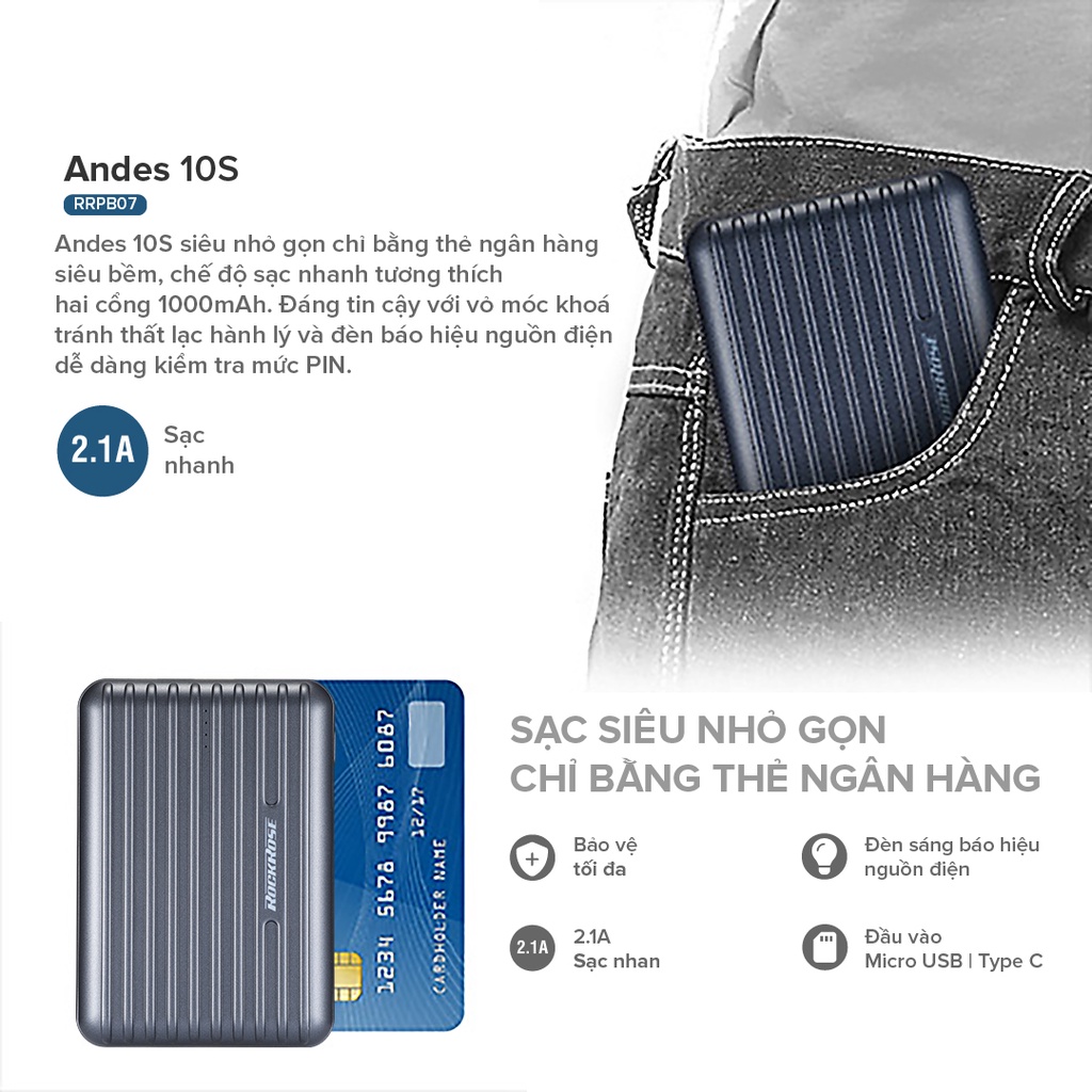 - ROCKROSE ANDES 10S chỉ có kích thước nhỏ gọn tương đương với một chiếc thẻ ngân hàng. Điều này giúp viên pin này cơ động hơn và luôn sẵn sàng để đồng hành cùng người dùng đem theo tới bất cứ đâu. Ngoài ra, pin có thiết kế với những đường sọc nổi giúp tăng độ thẩm mỹ cũng như trải nghiệm cầm nắm, giữ trên tay để sạc cho điện thoại khi đang di chuyển ngoài đường sẽ rất thoải mái.