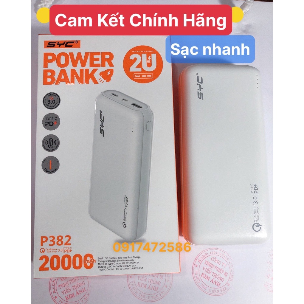 Sạc Dự Phòng SYC P382 dung lượng 20000 mAh (PD 18W, QC3.0) Sạc Nhanh 2 Chiều Type C, Hàng chính hãng