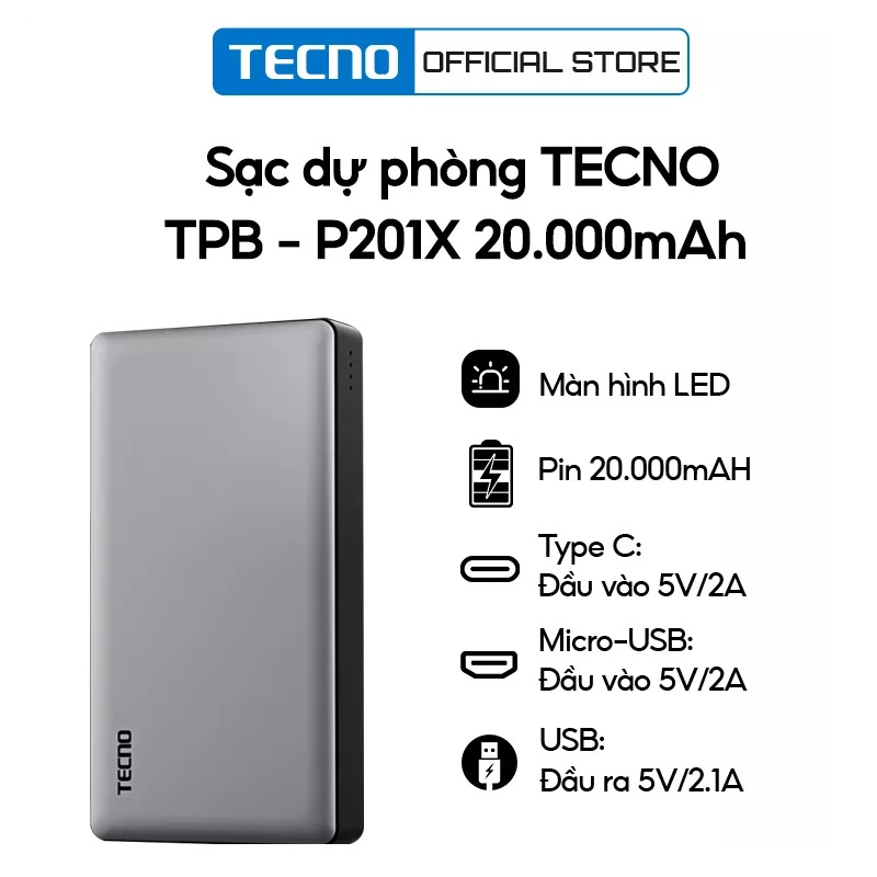 Sạc dự phòng Tecno 20000 maH | TPB-P201X | Màn hình LED | An Toàn Trên Máy Bay | Bảo hành 6 Tháng