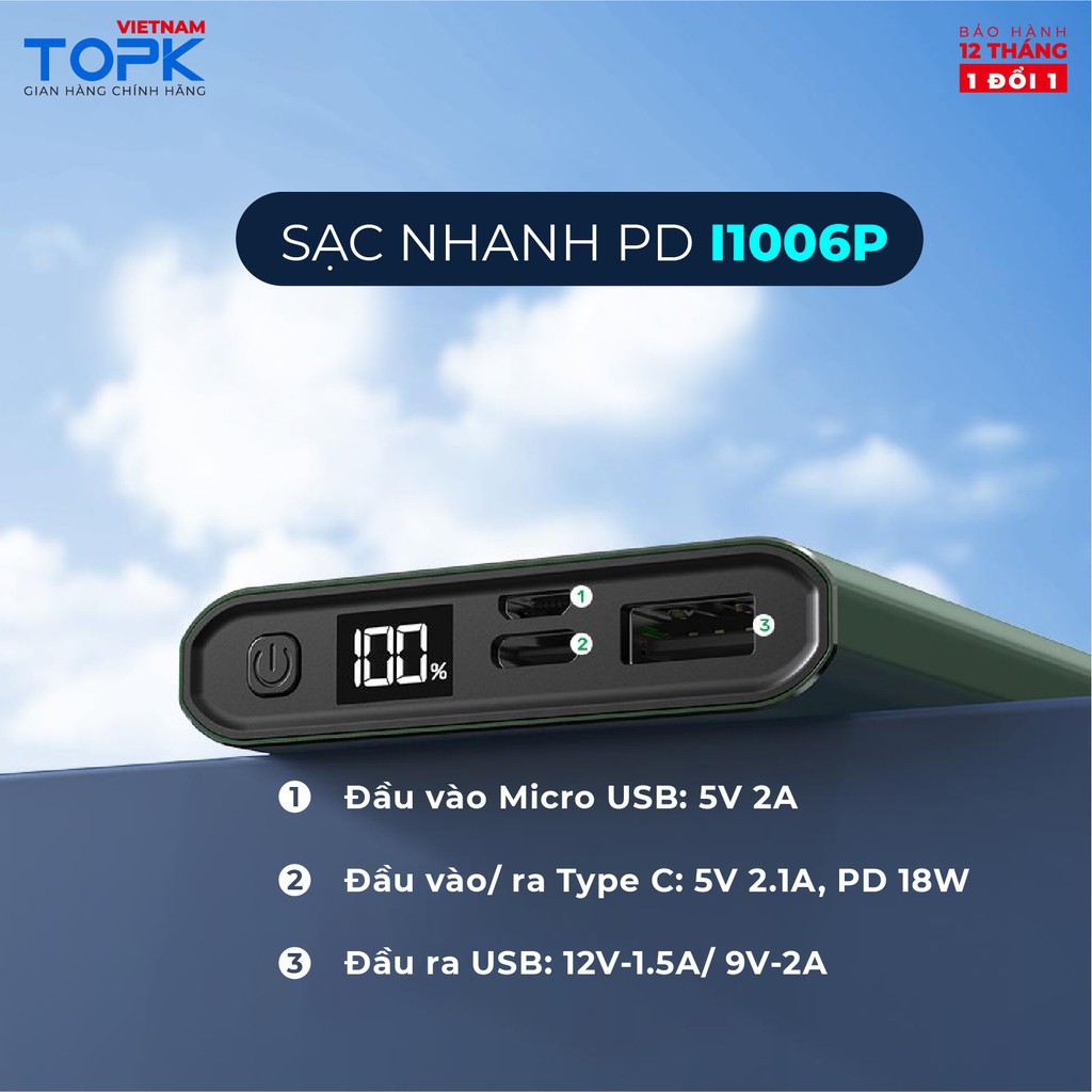 Sạc dự phòng TOPK I1006P 10000mAh - Sạc PD 18W - Màn hình LED - Hàng phân phối chính hãng - Bảo hành 12 tháng 1 đổi 1