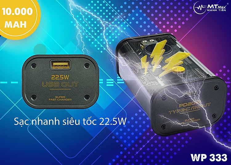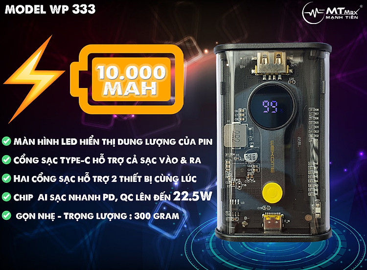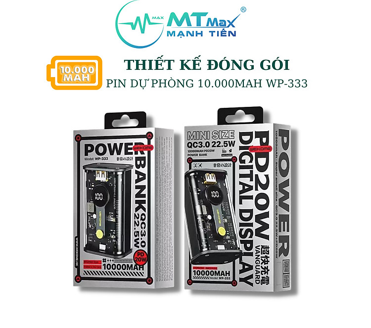 THÔNG SỐ SẢN PHẨM SẠC DỰ PHÒNG WEKOME WP-333 - Dung lượng: 10.000Ah - Đầu ra: USB 1/2: 22,5W; Loại-C: PD 20W;- Hỗ trợ các giao thức sạc như PD, QC, FCP / SCP, AFC, VOOC, DASH, v.v.- Màn hình: Đèn ...- Giao hàng toàn quốc