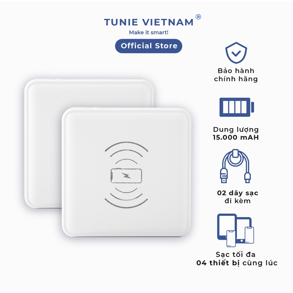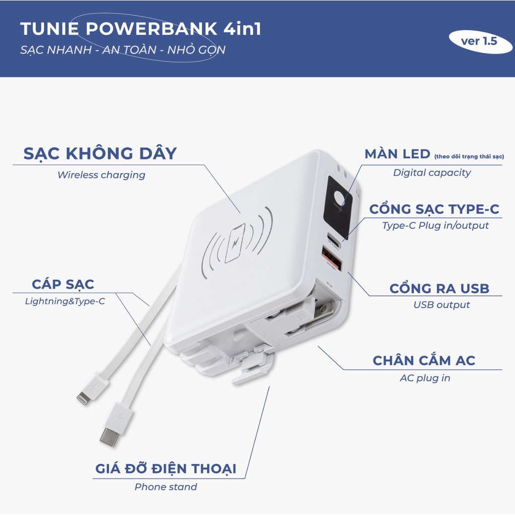 Sạc dự phòng Tunie 4in1 15000mAh hỗ trợ sạc nhanh, kèm cáp sạc, sạc không dây, màn LED hiển thị