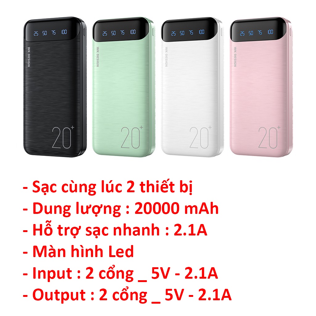 - Sạc dự phòng 10.000mAh nhỏ gọn thời trang Wk 161 sạc 2 thiết bị cùng lúc.