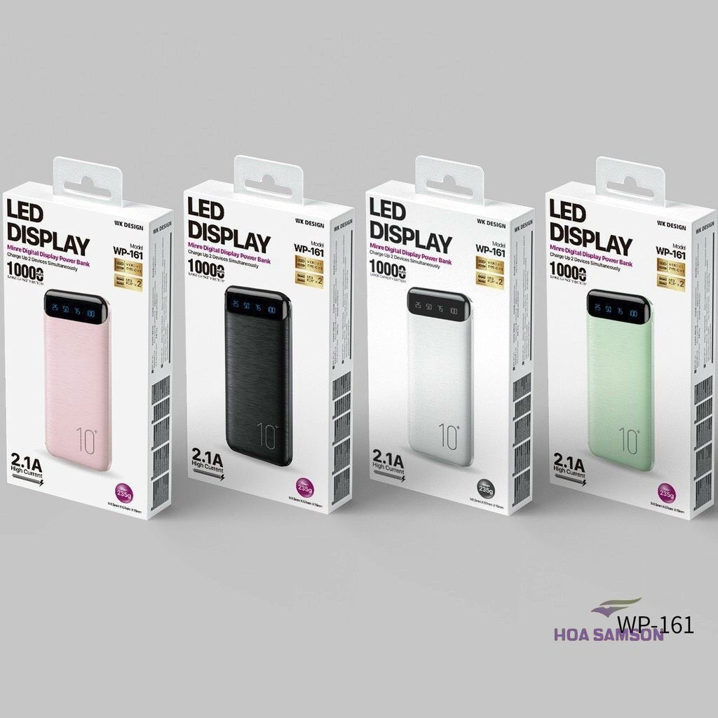 - Sạc dự phòng 10.000mAh nhỏ gọn thời trang WP-161 sạc 2 thiết bị cùng lúc. Hỗ trợ sạc nhanh 2.1A. Chất liệu nhựa PC+ABS, an toàn, chống cháy nổ.