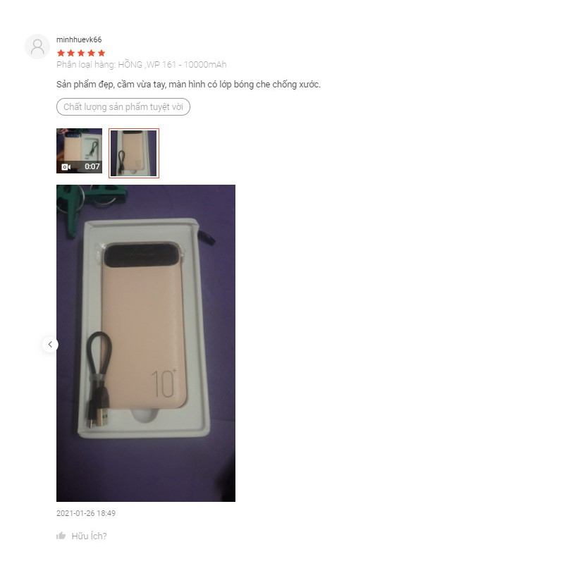 - Vỏ sạc được làm từ nhựa PC + ABS cao cấp, thiết kế bề mặt láng mịn tạo cảm giác mềm mại khi cầm nắm. Sạc dự phòng 10000mAh WP-161 có đến 4 phiên bản màu sắc khác nhau cho bạn lựa chọn: Xanh, Hồng, Trắng, Đen.
