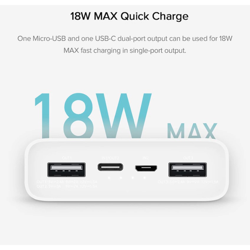 -Đặc biệt, phiên bản viên pin sạc dự phòng gen 3 này còn cho khả năng sạc nhanh 2 chiều vào ra với công suất tối đa 18W. Giao diện đầu ra USB-A có thể cung cấp năng lượng cùng lúc cho 2 thiết bị với dòng điện 5.1V-2.6A và hỗ trợ sạc nhanh 18W Max khi sử dụng cổng đơn