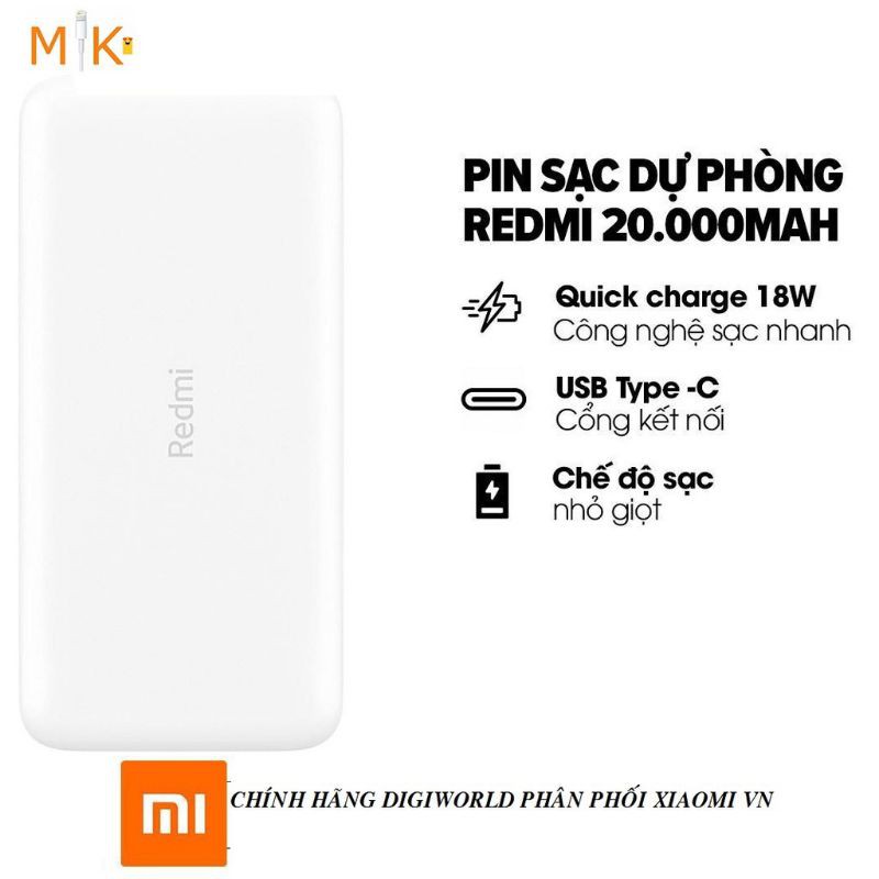 ► Redmi 20.000 mah là dòng sản phẩm sạc dự phòng mới nhất của Xiaomi với giá " không tưởng " , nếu các bạn cần 1 mẫu pin dự phòng dung lượng cao mà giá phải chăng ( nếu không nói là ngon nhất ) và quan trọng là thương hiệu lớn như Xiaomi thì mẫu này là sự lựa chọn tốt nhất !► Sản phẩm do chính Digiworld là nhà phân phối chính thức tại VN bán , có tem nhà phân phối bên ngoài hộp đảm bảo chất lượng cũng như việc bảo hành tốt hơn !