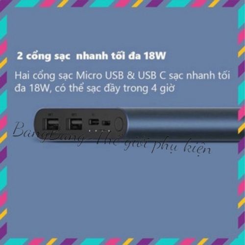 Hai cổng sạc USB-A có sạc nhanh với tốc độ cao 18W, sạc nhanh các thiết bị có hỗ trợ QC3.0. Hai cổng sạc vào MicroUSB và Type-C cũng hỗ trợ sạc nhanh giúp sạc đầy chỉ từ 4-6h.