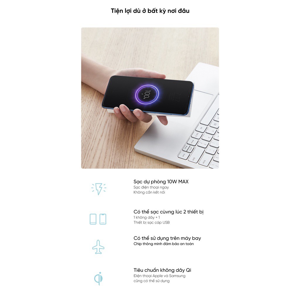 Sạc dự phòng Xiaomi Youth, pin dự phòng Xiaomi Youth hỗ trợ sạc không dây, Thiết kế gọn nhẹ,dễ mang theo, dung lượng lớn
