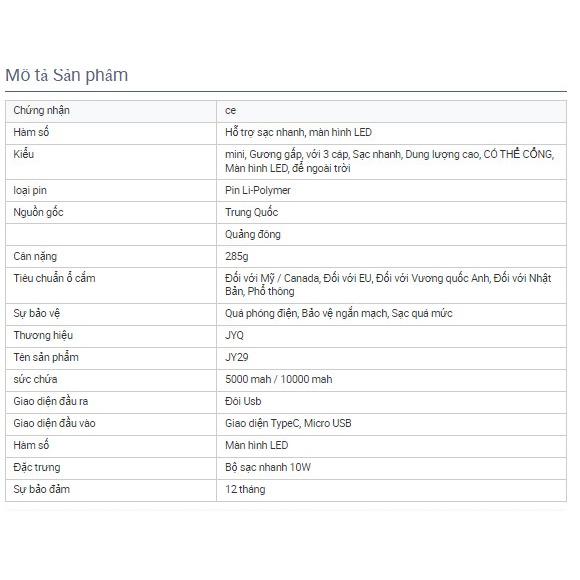 Thông số sản phẩm:✹Dung lượng Pin: 10.000 mAh.