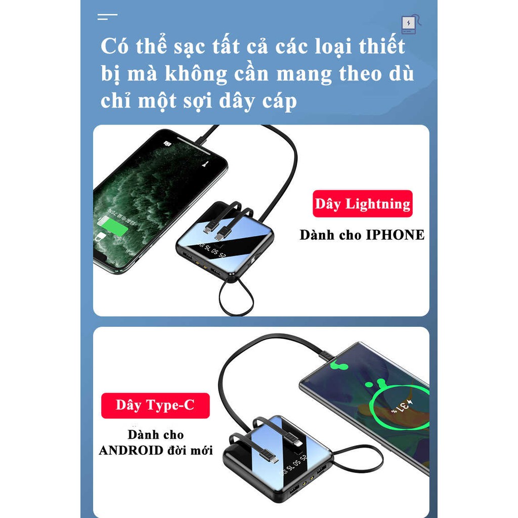 - Đầu ra có cổng Type C, Lightning, Micro USB và 1 cổng USB vô cùng tiện lợi, không cần dây sạc nhiều vướng víu