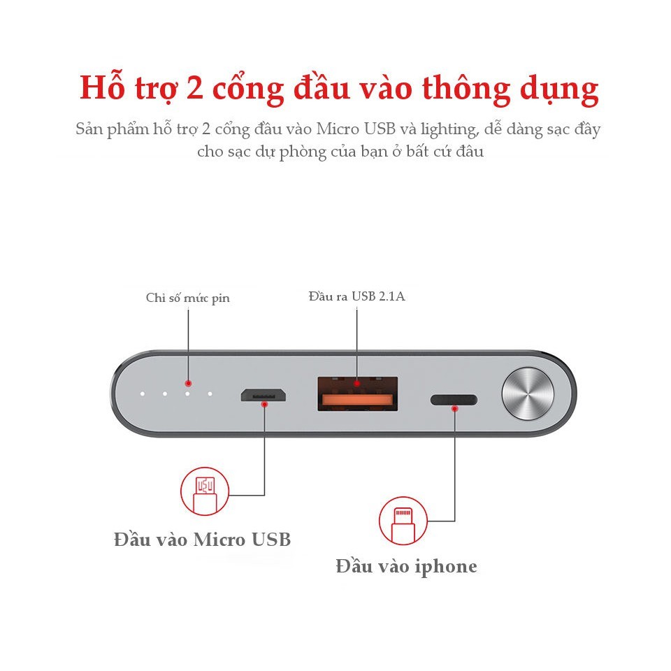 -Sạc được thiết kế vỏ nhôm sơn tĩnh điện cực chắc chắn. Hai cổng sạc vào lightning và micro usb tiện lợi. Đầu ra có thể lên tới 2.1A
