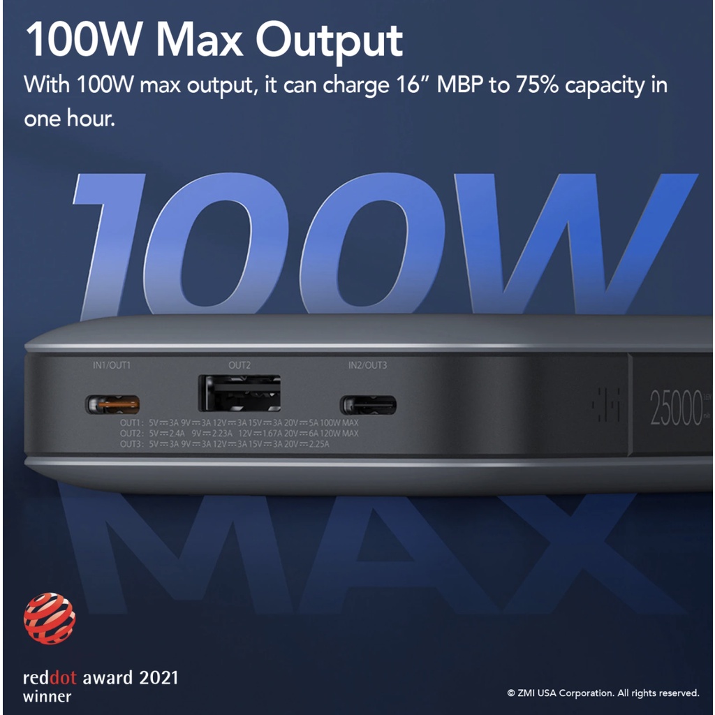 Tính năng, đặc điểmCó khả năng xuất 100W USB PD qua cổng USB-C đầu tiên. Sạc máy tính xách tay công suất lớn như MacBook Pro 16 inch. Đồng thời có khả năng phát ra công suất 45W từ cổng USB-C thứ hai và 65W từ cổng USB-A cho công suất tối đa kết hợp là 210W.