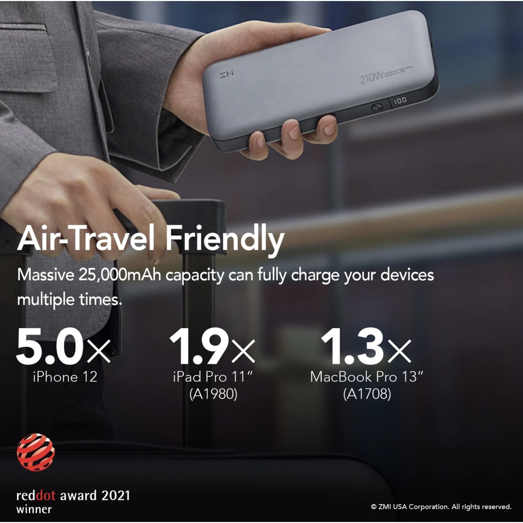 Dung lượng pin 25000 mAh có thể sạc được 1,3 lần cho MacBook Pro 13 inch. Nhưng vẫn dưới giới hạn kích thước pin do FAA quy định, vì vậy bạn có thể mang nó lên máy bay trong hành lý xách tay và sử dụng trong các chuyến bay.