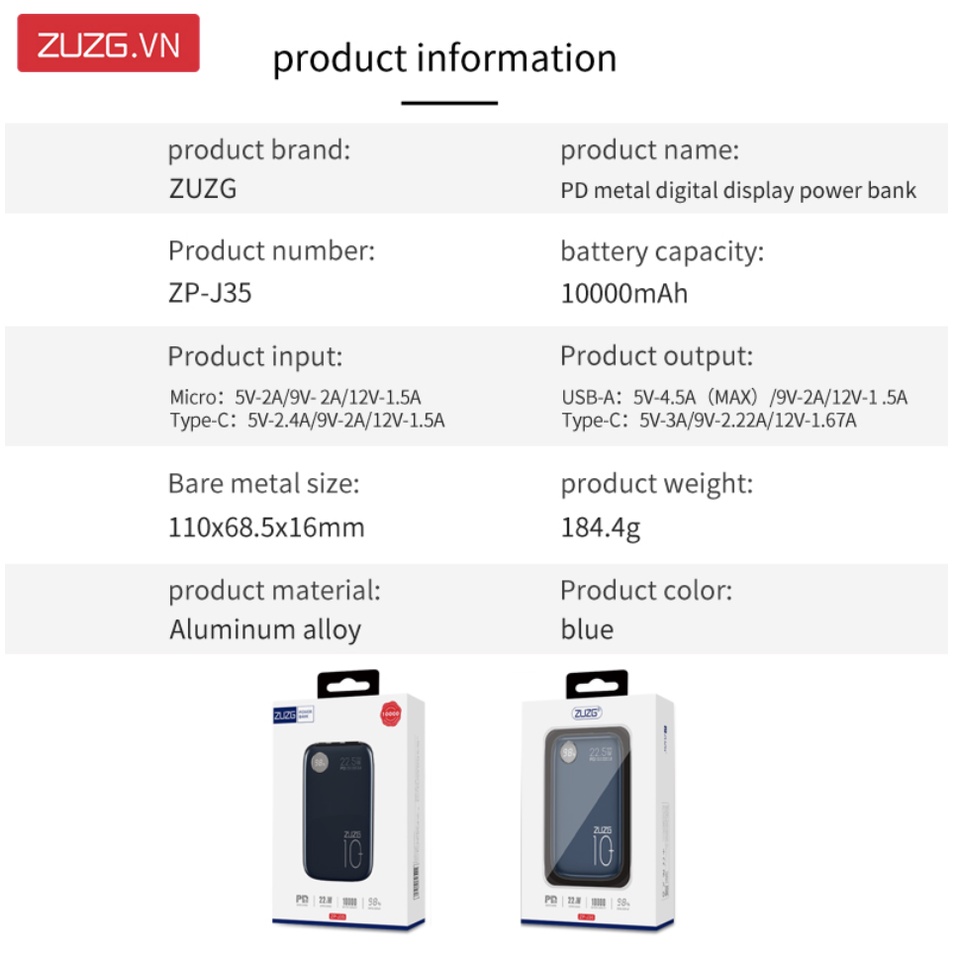 - Tên : Sạc dự phòng 10000mah chính hãng ZUZG J35