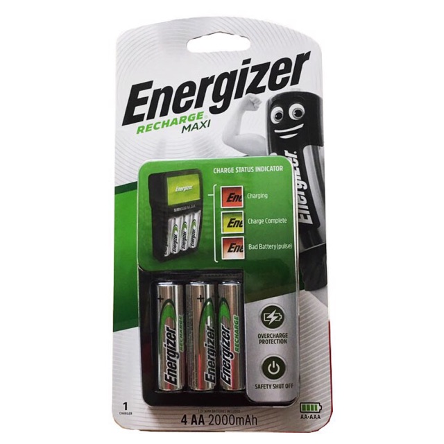Bộ Sạc Energizer Rechage Maxi bao gồm một máy sạc và 4 pin AA chính hãng công suất 2.000 mAh. Pin trong máy đã được sạc đầy pin khách hàng mua về sẵn dùng, khi pin báo yếu thì đem ra sạc đầy rồi sau đó tiếp tục dùng. Làm như vậy giúp kéo dài tuổi thọ pin.
