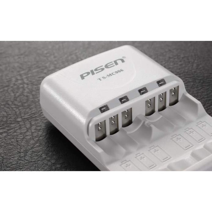 Bộ sạc kèm 4 pin AA 2500mAh chính hãng Pisen có nguồn điện mạnh với 6 ổ sạc điện, trong đó có 4 ổ sạc cho pin AA và 2 ổ sạc cho pin AAA. Bên trên sạc pin có 4 đèn led tín hiệu để báo khi pin sạc đầy. Giắc cắm của sạc ở phía sau, được thiết kế dạng gập, giúp người sử dụng kéo ra dễ dàng khi sạc và gấp gọn khi không sử dụng.THÔNG SỐ KỸ THUẬT: