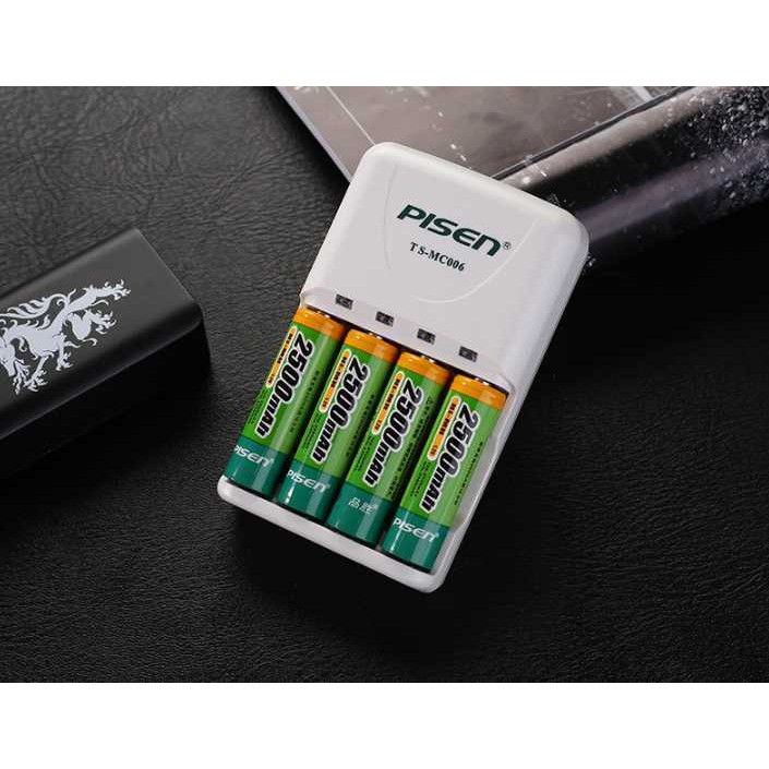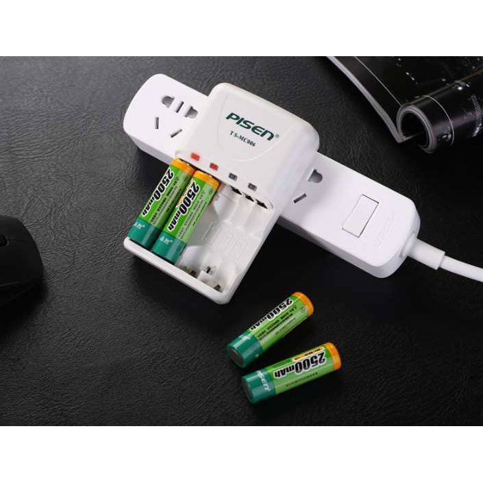 Bộ sạc kèm 4 pin AA 2500mAh chính hãng Pisen có nguồn điện mạnh với 6 ổ sạc điện, trong đó có 4 ổ sạc cho pin AA và 2 ổ sạc cho pin AAA. Bên trên sạc pin có 4 đèn led tín hiệu để báo khi pin sạc đầy. Giắc cắm của sạc ở phía sau, được thiết kế dạng gập, giúp người sử dụng kéo ra dễ dàng khi sạc và gấp gọn khi không sử dụng.THÔNG SỐ KỸ THUẬT: