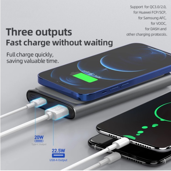 3. Đầu ra: USB-A: 22.5W hoàn toàn tương thích; Type-C: PD 20W; đầu ra sạc không dây: 5W / 7,5W / 10W / 15W; tổng đầu ra: 5V / 3A