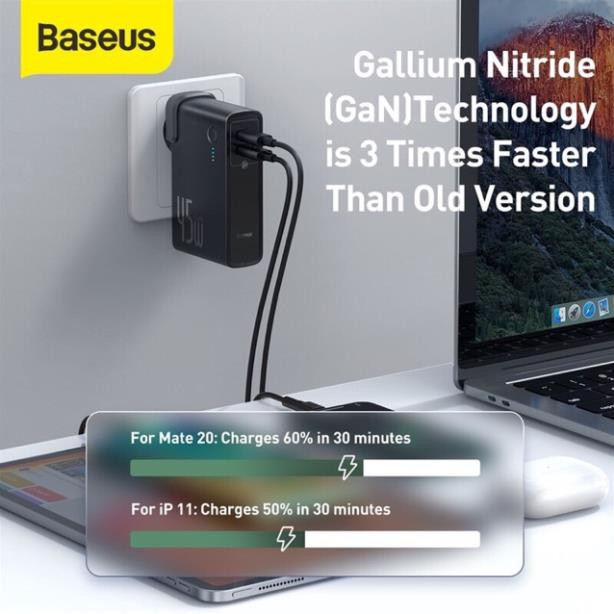 - Ngoài ra nhờ tích hợp chức năng Pin dự phòng với dung lượng 10.000mAh, với 2 công sạc hỗ trợ sạc công suất cao 45W. Bộ Sạc Nhanh Baseus 45W GaN không chỉ sạc cho điện thoại của bạn, mà còn có thể sạc cho chiếc máy tính xay tay của như Macbook 13inch