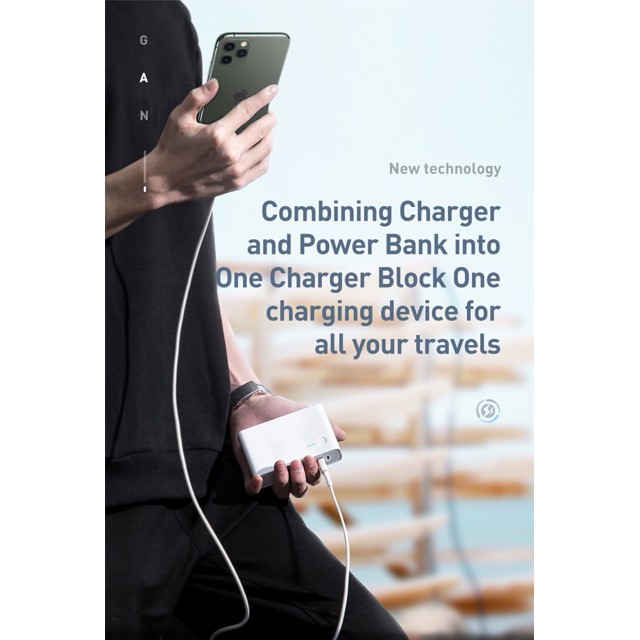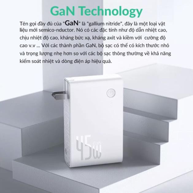 - Bộ Sạc Nhanh Baseus 45W GaN Fast Tích Hợp Pin Dự phòng 10000mAh sữ dụng công nghệ GaNFast giúp cho bộ sạc có tốc độ sạc nhanh. và ổn định nhiệt độ khi sạc giúp bạn có thể an tâm khi sạc, nhờ công nghệ GaN nên bộ sạc có kích thước siêu nhỏ.