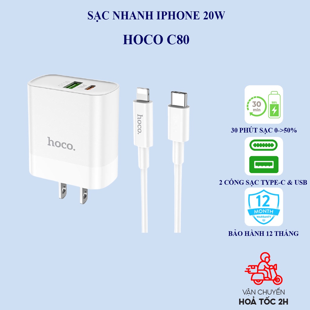 Điện Thoại & Phụ Kiện > Phụ kiện > Cáp, sạc & bộ chuyển đổi > Bộ sạc || Bộ sạc nhanh Iphone Hoco C80 2 cổng USB PD 20W QC 3.0, dây Type C to Lightning cho iPhone 11/12 ProMax/X/ 8/7plusCòn hàng
