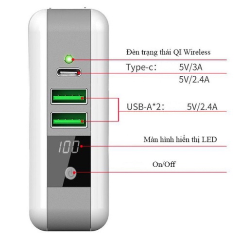 Chuẩn đầu ra: USB 5V ~ 2.4A, công suất QI không dây là 5W