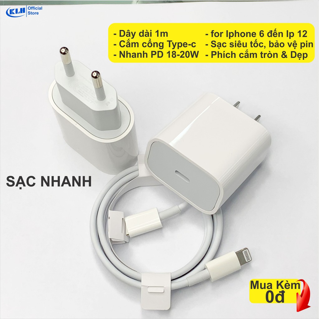 Sạc nhanh PD 18w - 20w bộ củ cáp sạt dùng cho iphone ip 6/7/7plus/8/x/11/12, cóc xạc cổng typec to lightning dây dài 1m
